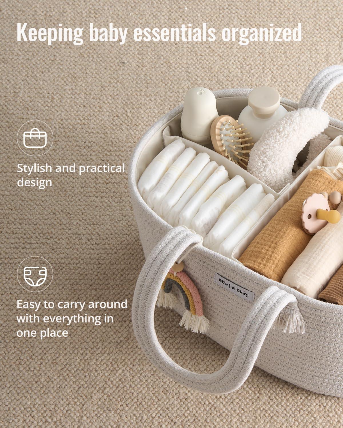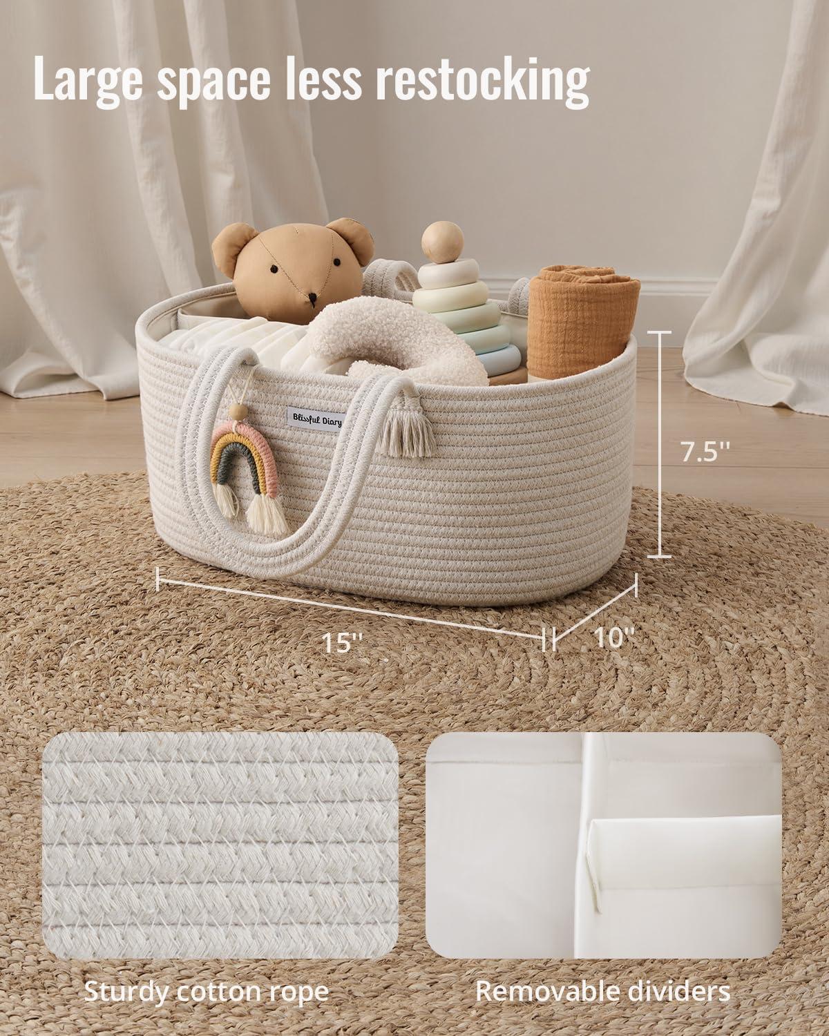 Blissful Diary Baby Diaper Caddy Organizer, Cotton Rope Diaper Caddy Basket, Large Storage Basket for Newborn Boys and Girls, Gift for Baby Shower List, Newborn Essentials, Natural Rainbow(Beige)