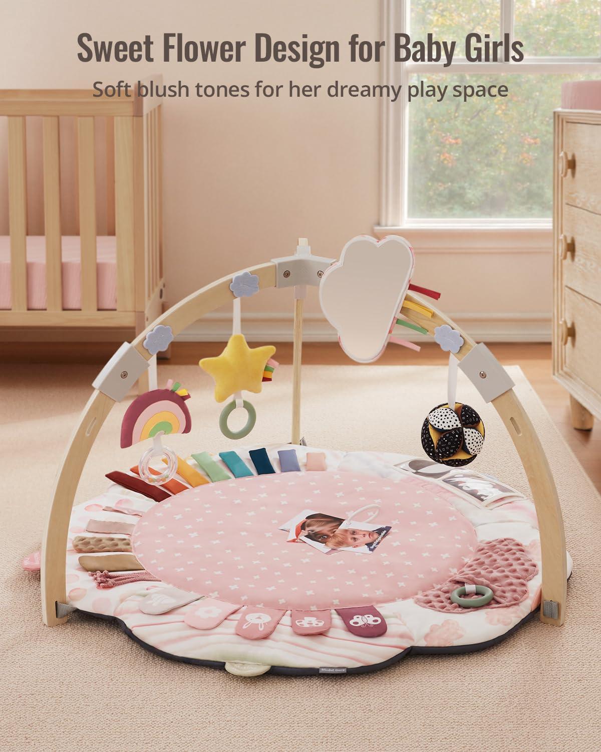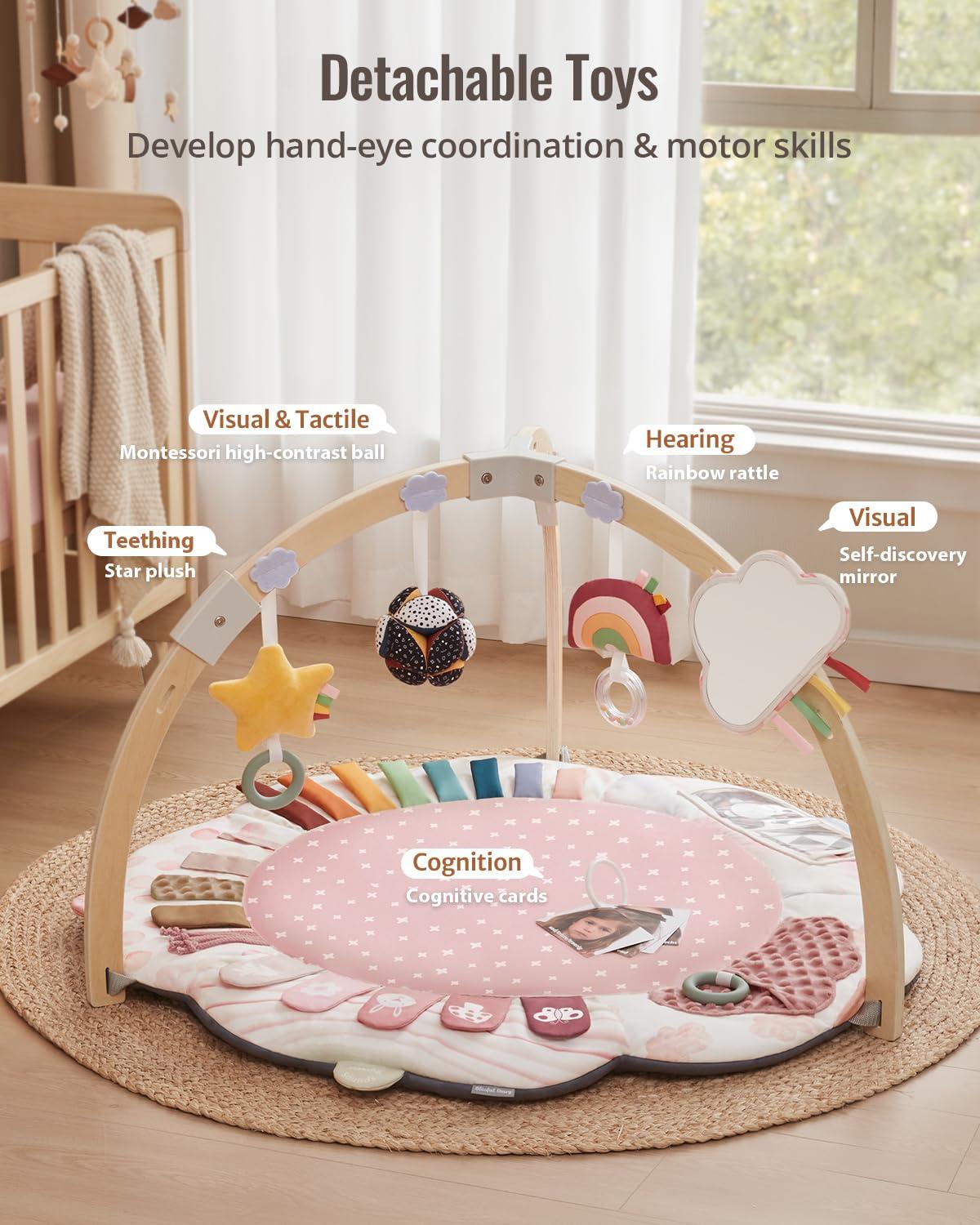 Blissful Diary Baby Play Gym & Activity Mat, 5 Developmental Zones Wooden Tummy Time Mat with 5 Detachable Sensory Toys for Motor Skills & Sensory Development, Baby Essentials Shower Gift, Pink Flower(Pink Flower)
