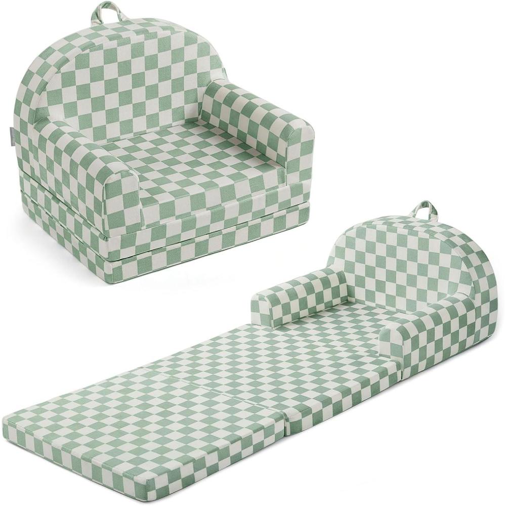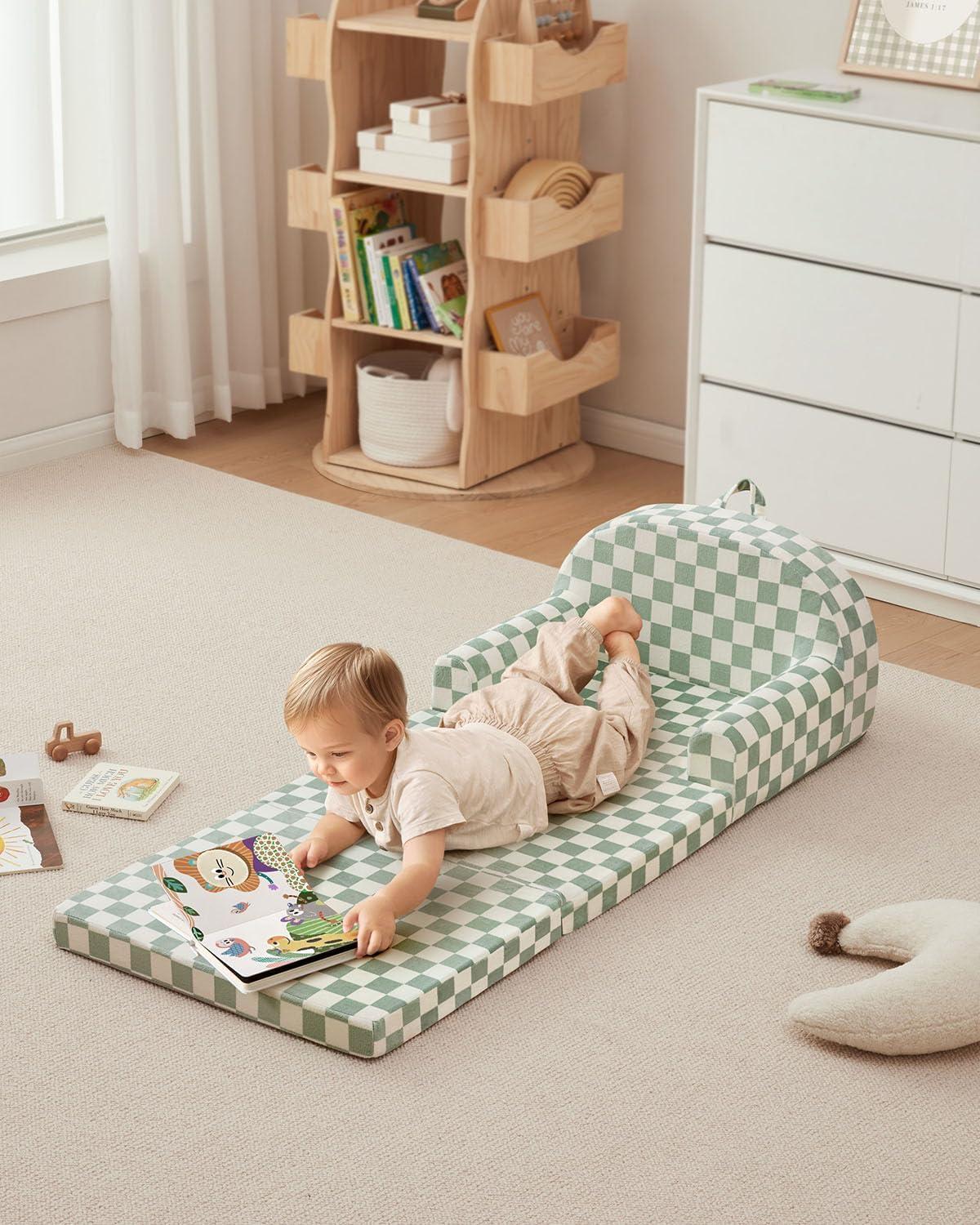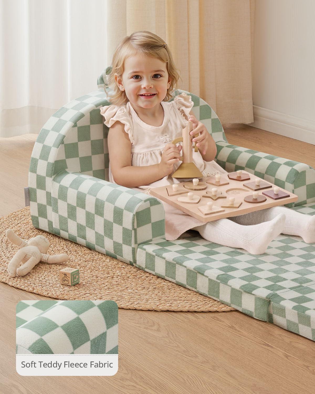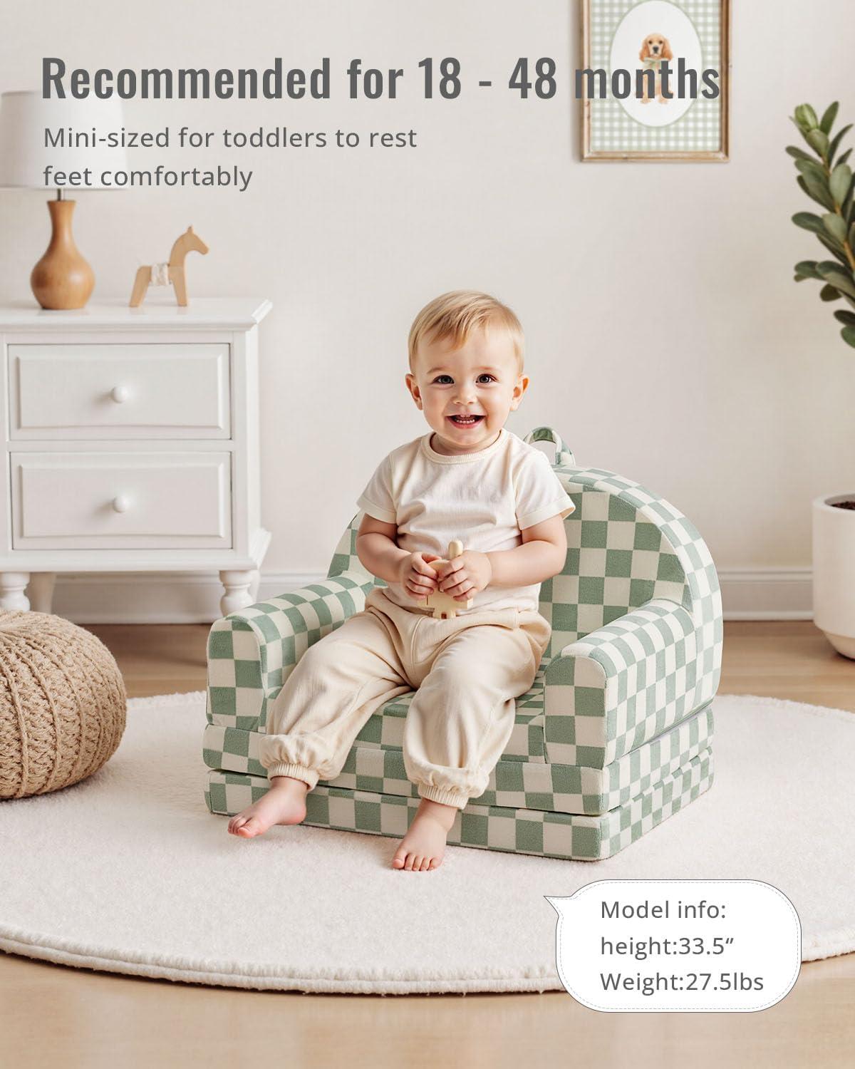 Toddles Gifts for Christmas & Birthday & New Year: Adorable sage checkered toddler fold out couch for toddlers! Soft, safe and kid-sized. A thoughtful gift for boys girls birthday, Christmas, Children's Day. Perfect ''mini sofa'' for 18 – 48 months