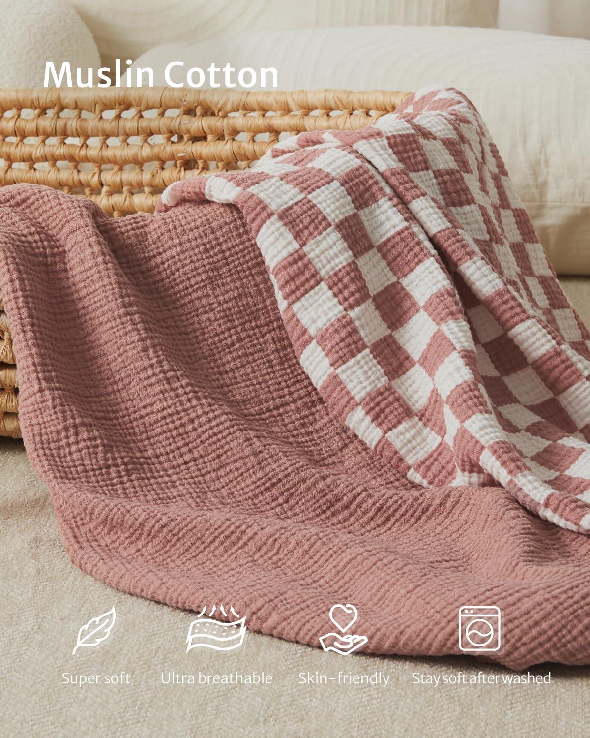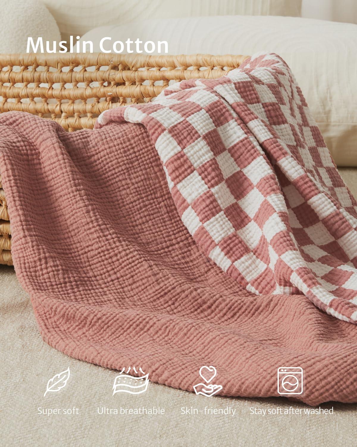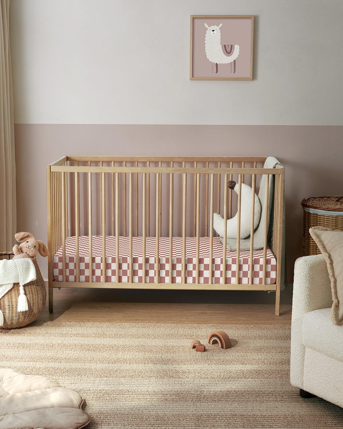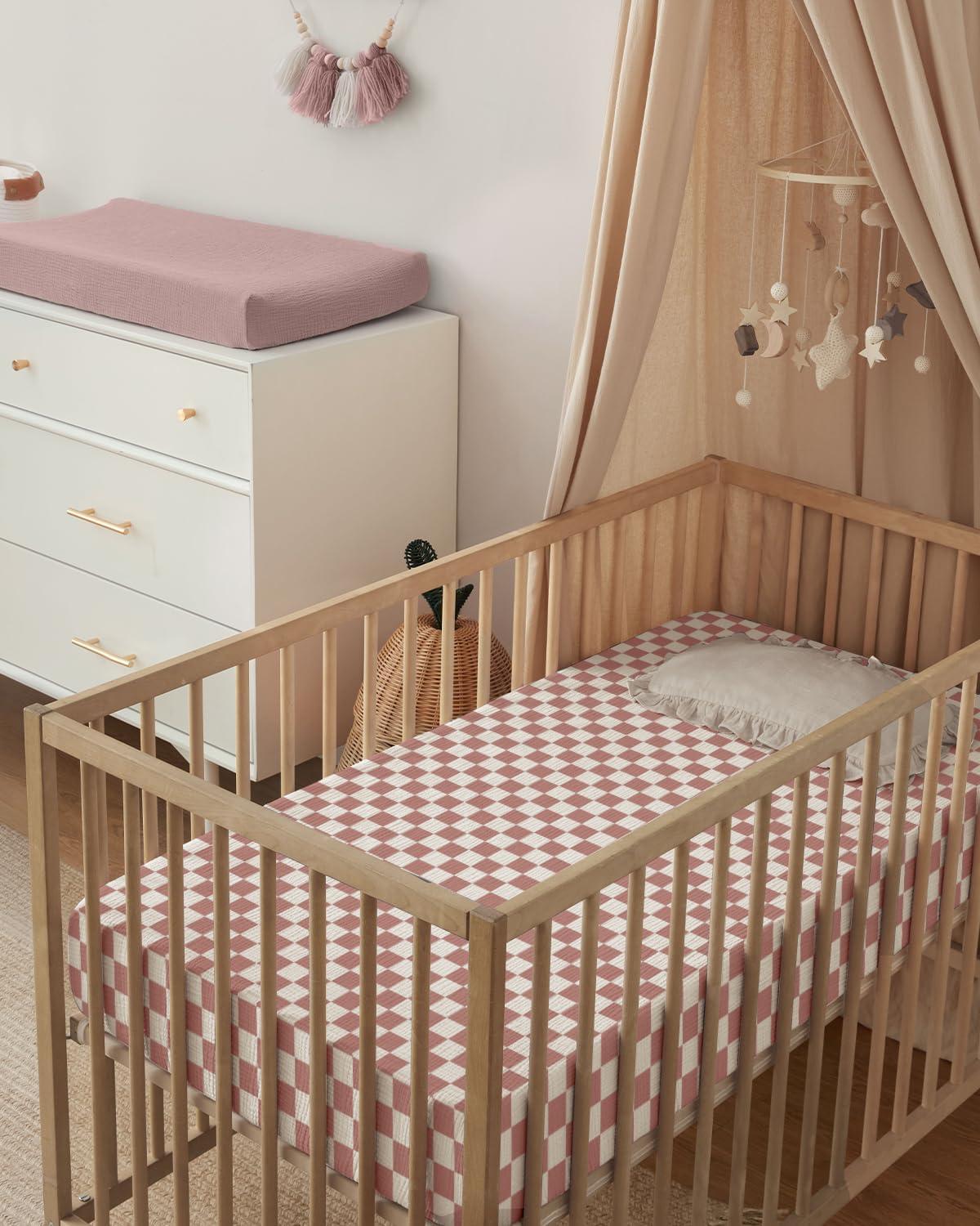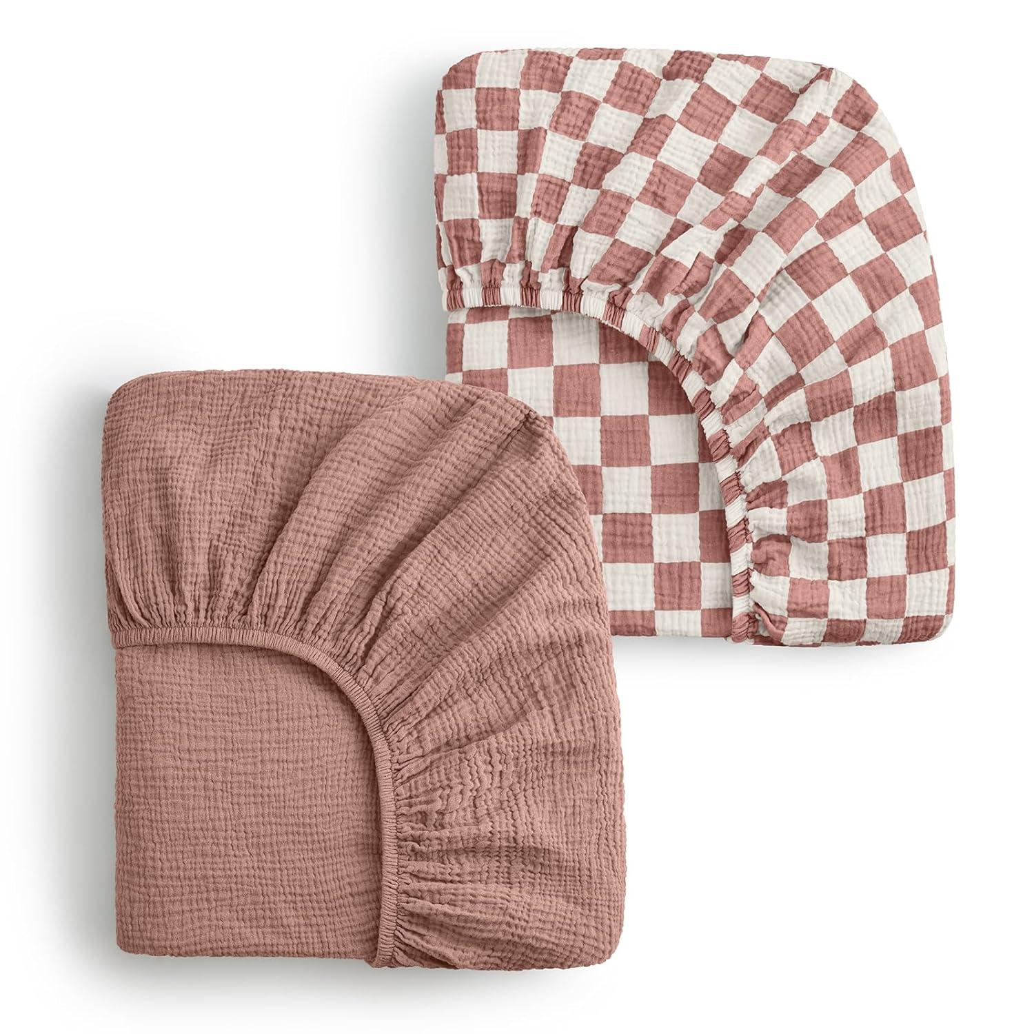 Blissful Diary Muslin Crib Sheets for Girl Boy, Boho Neutral Soft Cotton Baby Sheet for 52”x28” Standard Crib Mattress, 2 Pack(Brown Checkboard & Brown)(Dusty Pink Checkboard & Dusty Pink)