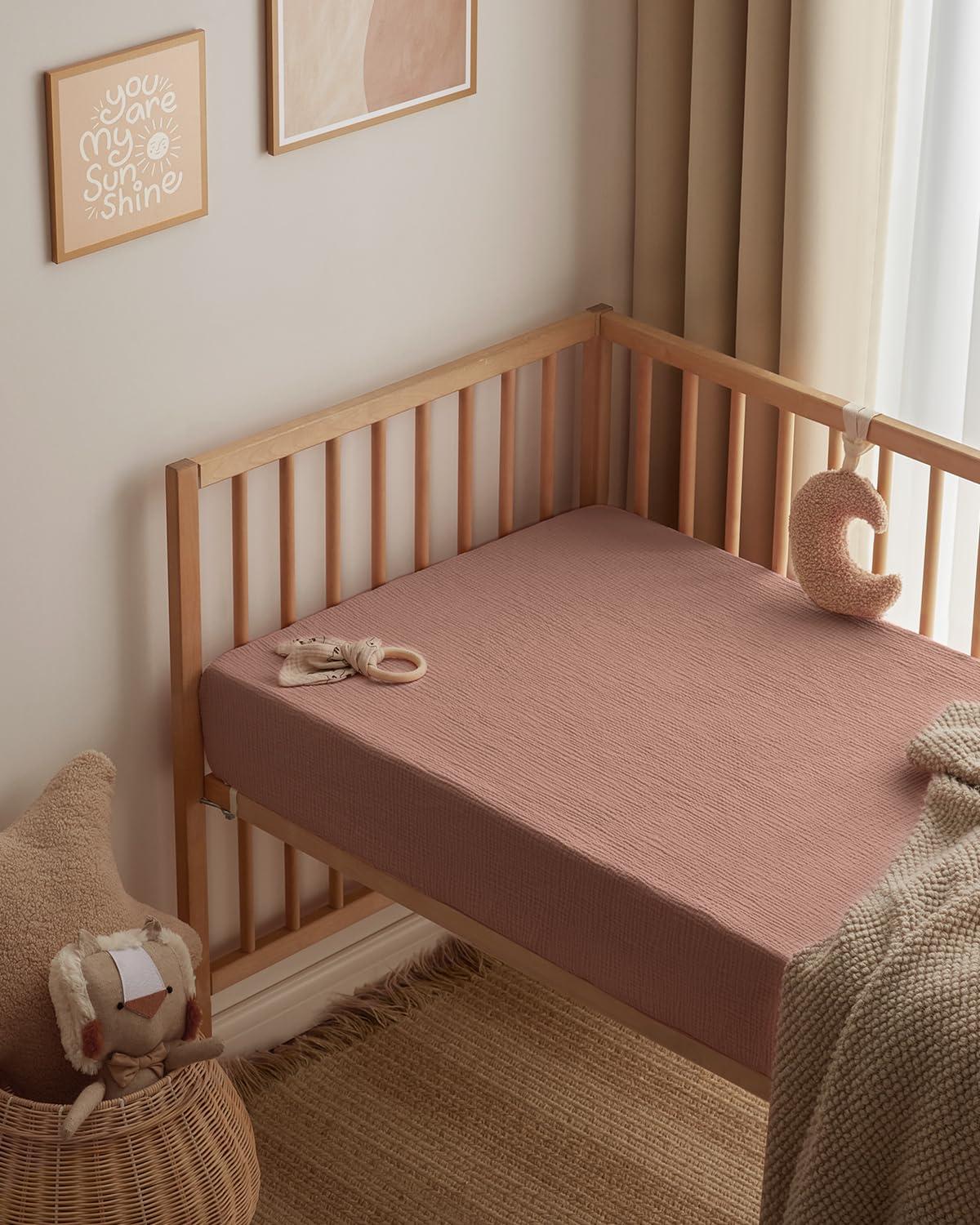 Premiun Muslin Cotton: Made from muslin cotton, our crib sheets are cozy and breathable in all seasons, making babies a better sleep. Plus, the soft muslin material is friendly for your baby's delicate skin