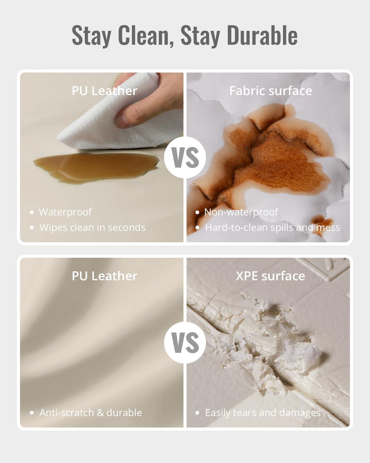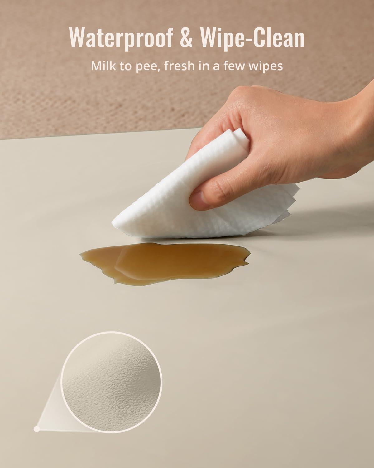 Waterproof and Wipe-clean: Unlike many other mats that absorb spills, our vegan leather baby play mat is 100% waterproof and easy to clean. Simply wipe away food, milk spills, or other messes to keep your baby's play area spotless and hygienic