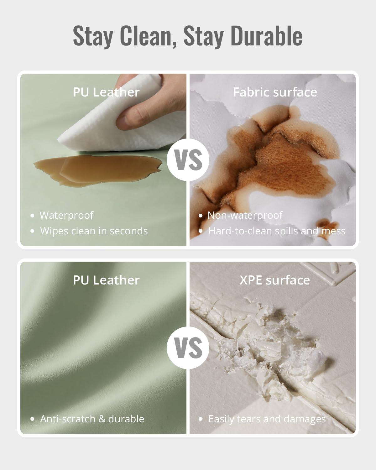 Waterproof and Wipe-clean: Unlike many other mats that absorb spills, our vegan leather baby play mat is 100% waterproof and easy to clean. Simply wipe away food, milk spills, or other messes to keep your baby's play area spotless and hygienic