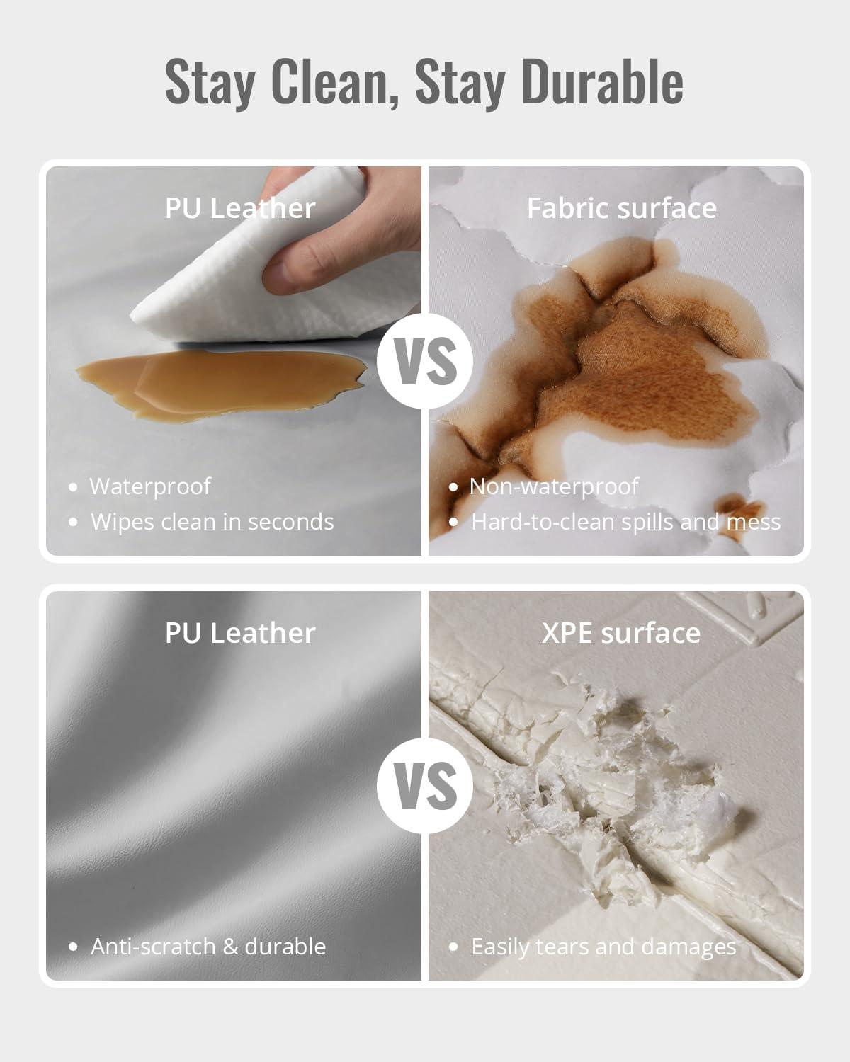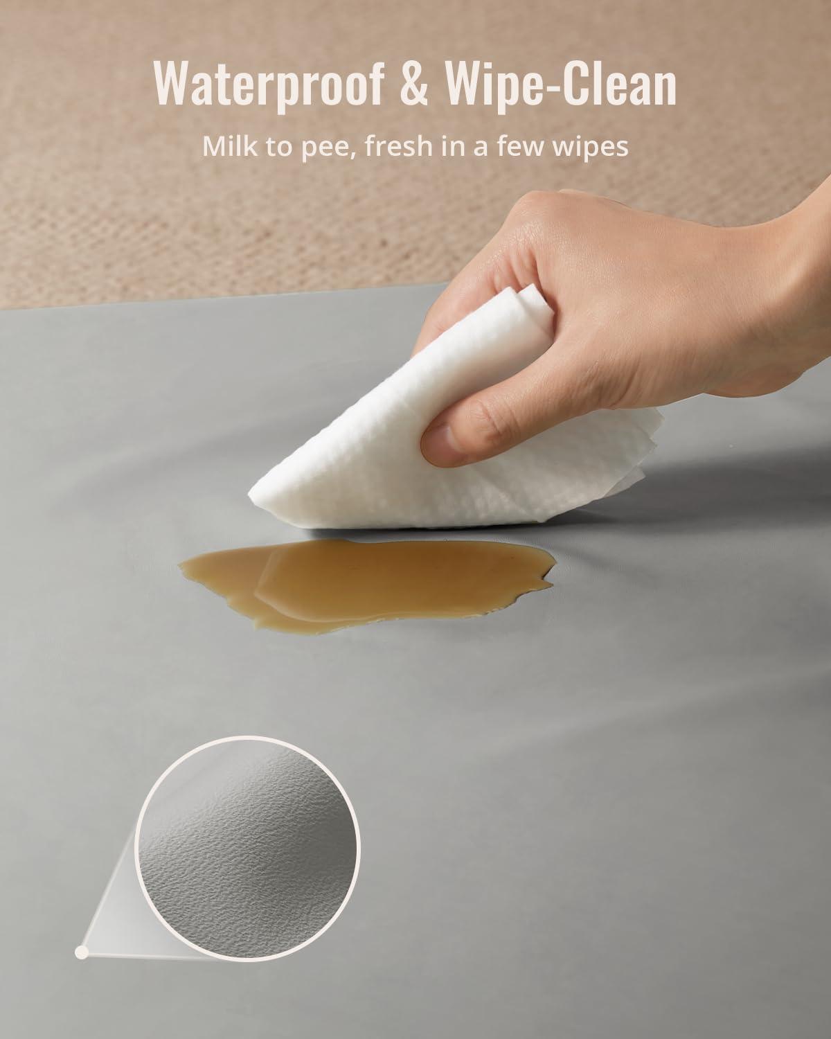 Waterproof and Wipe-clean: Unlike many other mats that absorb spills, our vegan leather baby play mat is 100% waterproof and easy to clean. Simply wipe away food, milk spills, or other messes to keep your baby's play area spotless and hygienic
